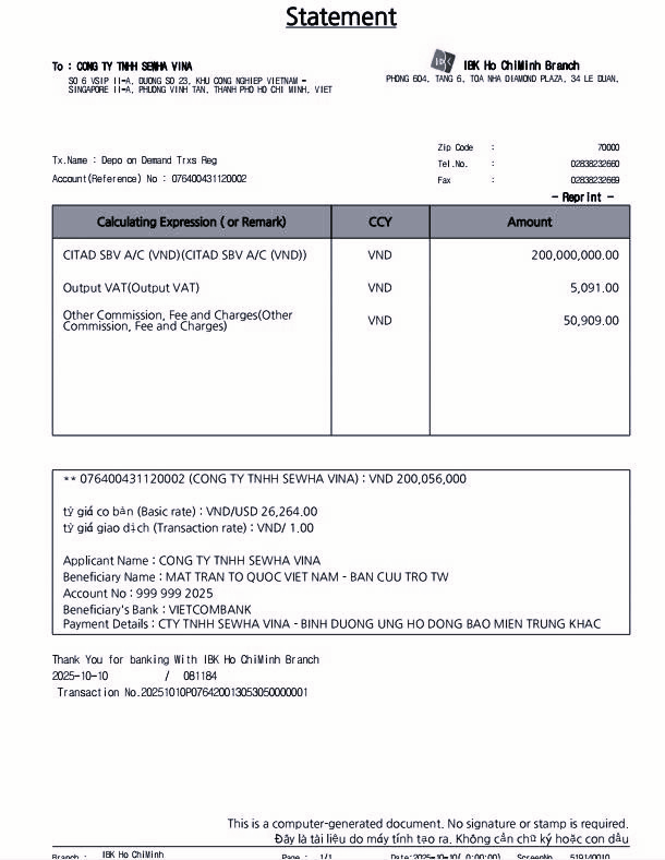 Sewha Vina ủng hộ 200 triệu VND cho đồng bào các tỉnh đang bị thiệt hại bởi bão lũ năm 2025